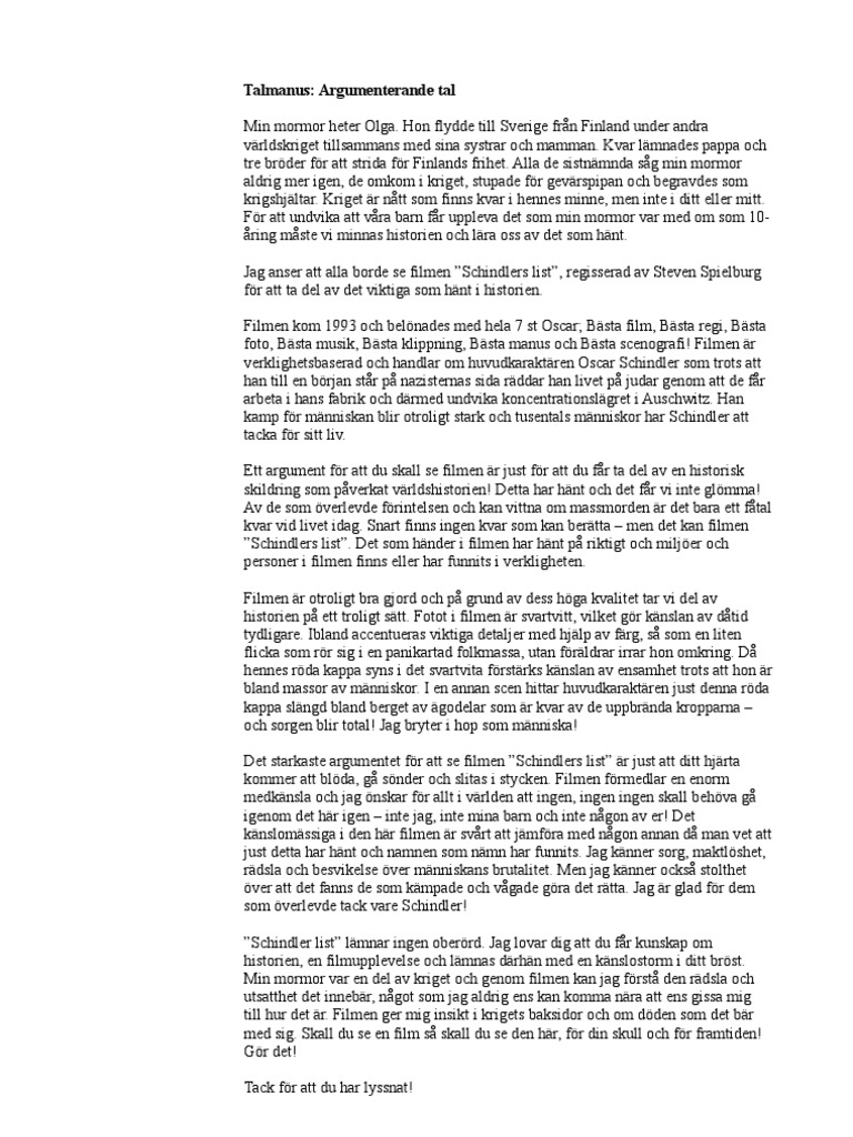 Argumenterande Tal Schindlers List Pdf